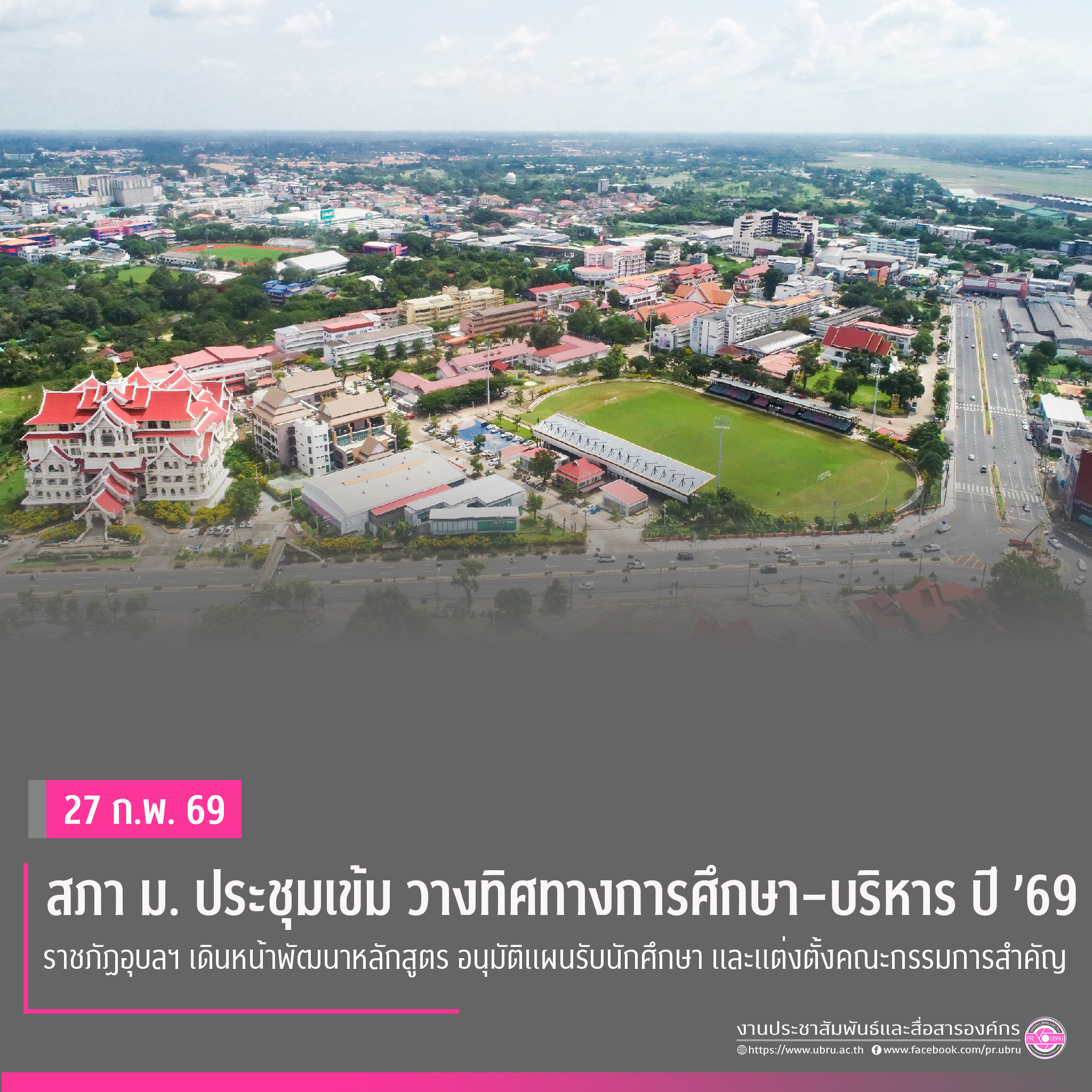 เช้าวันนี้ (๒๗ ก.พ. ๒๕๖๙) ที่ห้องประชุม ชั้น ๓ อาคารเรียนและปฏิบัติการ มหาวิทยาลัยราชภัฏอุบลราชธานี จัดการประชุมสภามหาวิทยาลัย ครั้งที่ ๒/๒๕๖๙ ผ่านสื่ออิเล็กทรอนิกส์ โดยมี พลเอก นิรุทธ เกตุสิริ นายกสภามหาวิทยาลัย เป็นประธานการประชุม